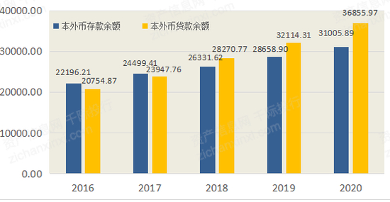 图 2016 - 2020年武汉市金融机构本外币存贷款余额(单位:亿元)
