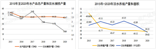 全市水产品总产量由2015年的52.46万吨,下降到2020年的42.67万吨,年均下降4.0%。其中:淡水捕捞产量由2015年的2.80万吨,下降到2020年的0.89万吨,年均下降20.5%。淡水养殖产量由2015年的49.66万吨,下降到2020年的39.62万吨,年均下降4.4%;淡水养殖面积由2015年的43.07千公顷,下降到2020年的39.22千公顷,年均下降1.9%。