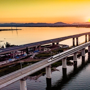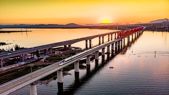 朝阳中,京张高铁复兴号智能动车组从官厅水库特大桥飞驰而过。 贾佳/摄