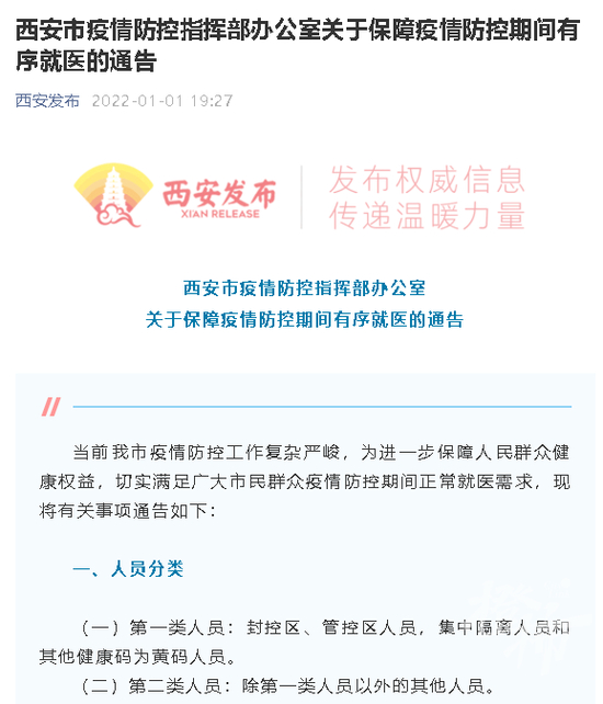 事发当晚,西安发布了一条疫情就医新政:《西安市疫情防控指挥部办公室关于保障疫情防控期间有序就医的通告》。