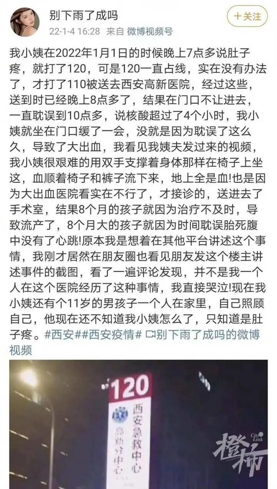 1月4日,陕西西安,一名产妇家属发帖称:元月1日,自家小姨肚子疼打不通120,随后打110将小姨送往医院。晚上8点多到达西安高新医院,在门口由于核酸问题无法入院,一直等到晚上10点多。
