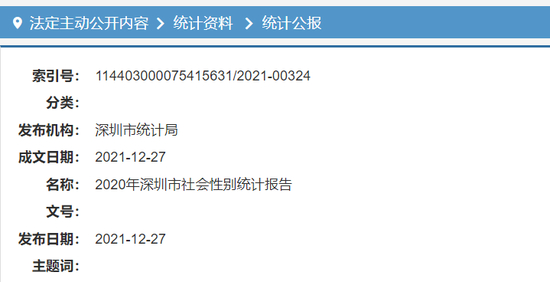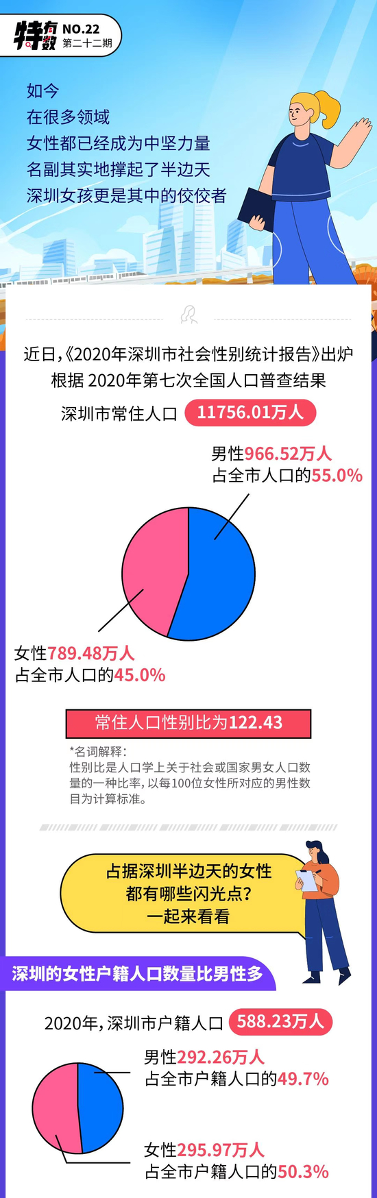 近日,深圳市妇女儿童工作委员会、市统计局、市性别平等促进办公室联合发布了《2020年深圳市社会性别统计报告》,从性别视角对深圳市人口特征、婚姻家庭状况、文化教育、就业、社会保障、卫生与健康、参政议政、参与公共事务、法律保护等领域反映男性和女性的发展状况。