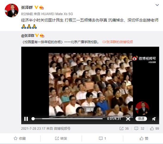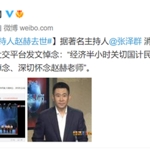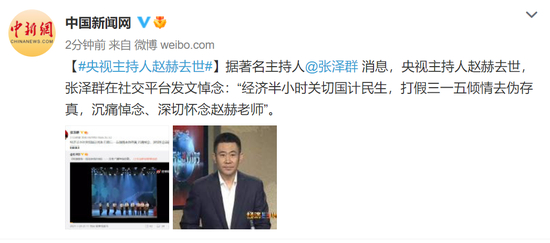 据著名主持人@张泽群 消息,央视主持人赵赫去世,张泽群在社交平台发文悼念:“经济半小时关切国计民生,打假三一五倾情去伪存真,沉痛悼念、深切怀念赵赫老师”。