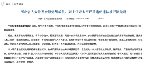 1月10日,中央纪委国家监委官网发布消息,河北省人大常委会原党组成员、副主任宋太平被开除党籍。