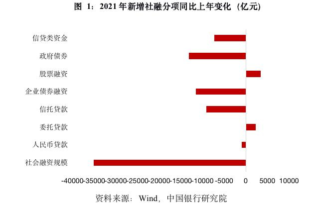 初步统计,2021年末社会融资规模存量为314.13万亿元,同比增长10.3%。2021年社会融资规模增量累计为31.35万亿元,比上年少3.44万亿元,比2019年多5.68万亿元。从社融增量细项来看,除外币贷款和股票融资外,其余科目大都出现少增。