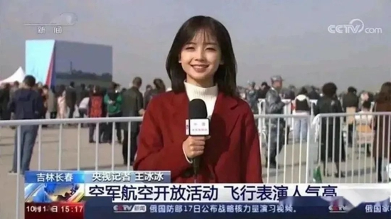 被视作“梦开始的地方”的,是2020年8月,有媒体在微博转发了一条2019年长春空军飞行表演的采访片段。视频里,王冰冰一袭红大衣出镜,眉眼弯弯,笑容甜美,和空军战士的互动也亲切自然,惊艳一大片观众。