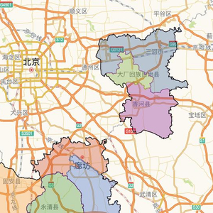 其中,三河市位于河北省东北偏北、廊坊地区最北端,以地近洳河、鲍邱河、泃河三水故得名,与北京仅一河之隔,总面积643平方公里;大厂回族自治县是距北京最近的一个少数民族自治县,总面积176.3平方公里,县域东北与三河市交界,南与香河县接壤,西、西南与北京市通州区隔着潮白河相望;香河县位于河北省中部偏东,位于北京市和天津市之间,总面积458平方公里。