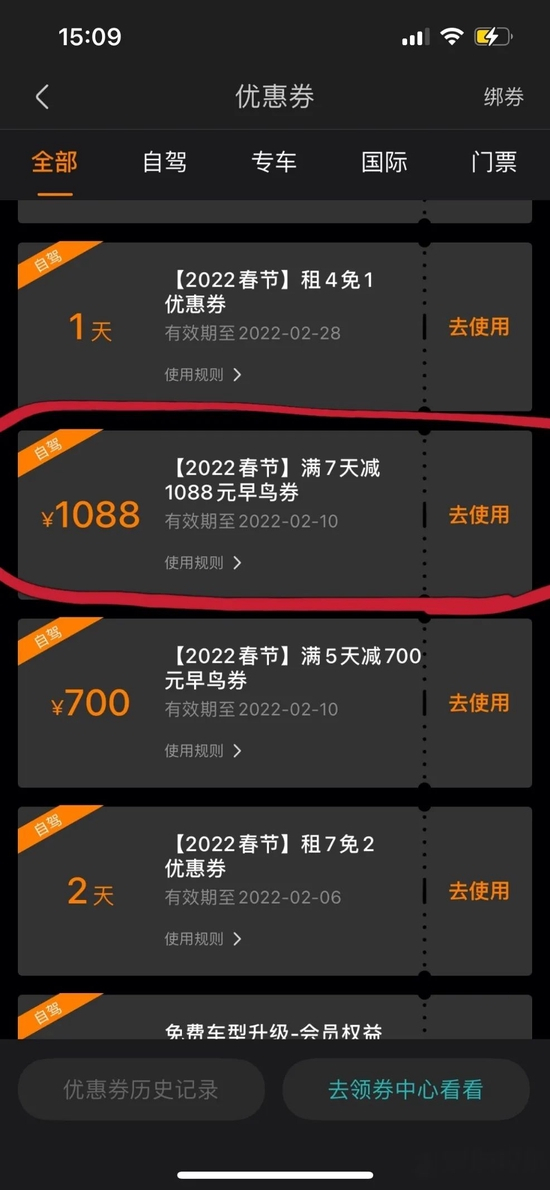 1月23日,有用户向《证券日报》记者表示:“一嗨租车这个1088元的优惠券是我2021年12月份领取的,想着过年回家时租车使用,但1月18日打开手机准备使用,却显示不在使用时间范围,优惠券里面明明是有这张券的,有效期也显示是2022年2月10日过期,但就是不能用,我打电话咨询,客服说是2022年1月17日之前必须下单才行,但是1月17日之前平台也并没有给我发消息说要过期了。”