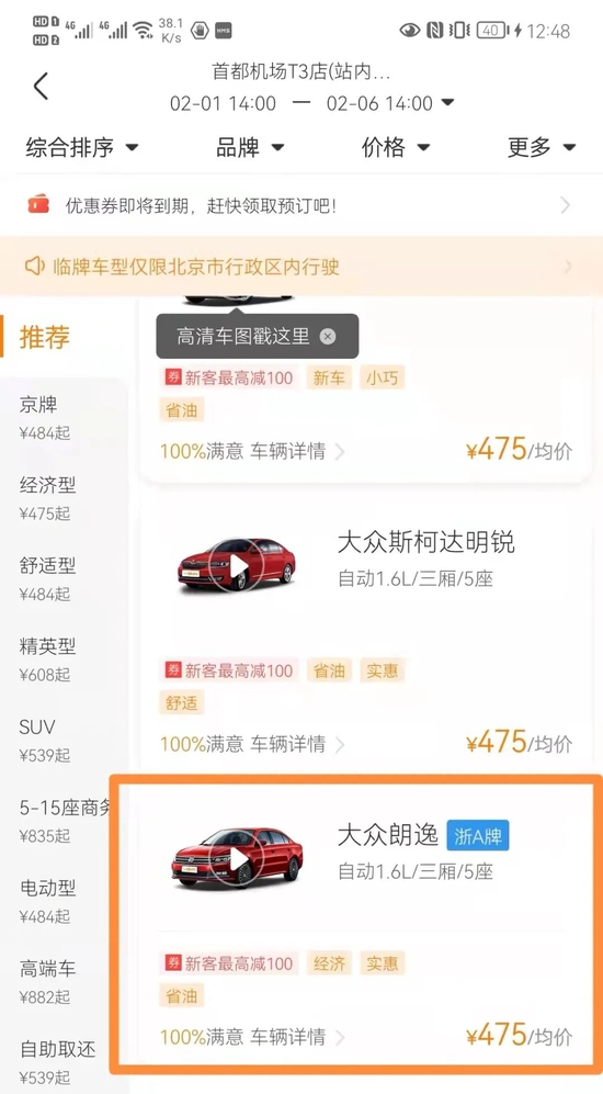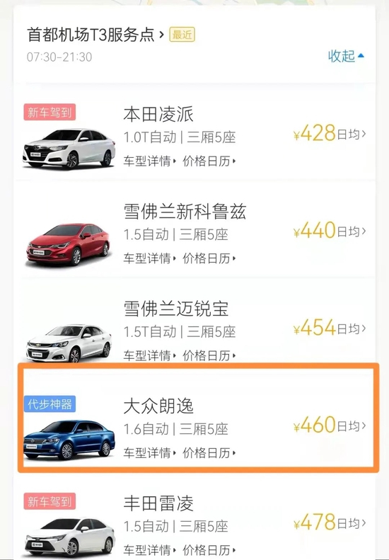 记者查询获知,同一个取车点(首都机场T3航站楼),同样的用车时间(过年期间),同一款车型(大众朗逸),一嗨租车APP显示的每天的租车均价比竞品要高,且还是外地牌照。