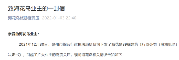 就在1月3日深夜,恒大童世界集团(原海花岛产业集团)通过“海花岛旅游度假区”官微发布了《致海花岛业主的一封信》表示,2021年12月30日,儋州市综合行政执法局给我司下发了海花岛39栋建筑《行政处罚(限期拆除)决定书》(以下简称决定书),引起了广大业主的高度关注。“我司将按照决定书的指引,积极沟通、妥善处理。”
