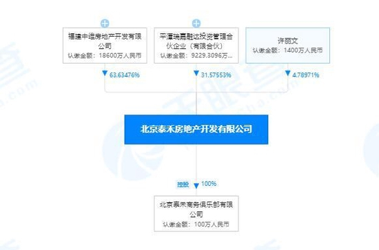 天眼查数据显示,北京泰禾房地产成立于2002年08月13日,注册地位于北京市通州区东石东一路1号院4号楼109,法定代表人为刘小岐。注册资本为29229.3096万人民币,大股东为福建中维房地产开发有限公司,持股比例63.63476%;平潭瑞嘉融达投资管理合伙企业(有限合伙)持股比例31.57553%;许丽文持股比例4.78971%。