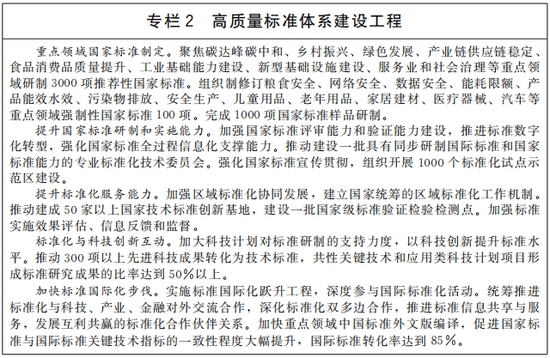 深化标准化改革创新。加快标准供给由政府主导向政府与市场并重转变,标准运用由产业与贸易为主向经济社会全域转变,标准化工作由国内驱动向国内国际相互促进转变,标准化发展由数量规模型向质量效益型转变。持续优化政府颁布标准与市场自主制定标准协调配合的新型标准体系,推动一般性产品、服务标准由市场自主制定,建立健全政府颁布标准采信市场自主制定标准的机制。建立法规引用标准制度,强化法规与标准有效协调机制,运用标准支撑法规落地实施。加强标准化技术组织建设,提升国家标准研制和实施能力。加强国家技术标准创新基地和国家级标准验证检验检测点建设,提升标准化技术支撑水平。实施标准全生命周期闭环管理,完善标准实施信息反馈与评估制度,建立国家标准动态维护机制。开展对标达标专项行动,推动团体标准培优计划和企业标准领跑者制度实施,消除标准制定团体培育发展的政策障碍,释放企业、社会团体标准化活力。