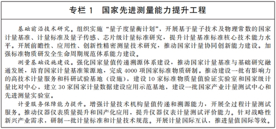 构建现代先进测量体系。加强以量子计量为核心的先进测量体系建设,加快建立新一代国家计量基准,推进社会公用计量标准升级换代,制定一批关系国计民生的重要计量技术规范。改革完善计量器具型式批准、检定、法制监督等管理制度,对强制管理的计量器具目录实施动态调整,完善商品量、计量数据等量值监管制度。深入推进计量技术机构改革创新发展,探索计量校准市场和校准机构建设的有效途径,规范计量校准市场,满足市场对量值溯源和测试服务的需求。建立国家计量数据建设应用示范基地,提升国家产业计量测试和能源计量能力。积极参与国际计量比对,提升国际承认的校准与测量能力。