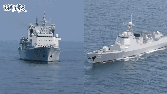 视频中出现的,是中方在此次联合军演中派出的两艘舰艇——导弹驱逐舰乌鲁木齐舰和综合补给舰太湖舰。