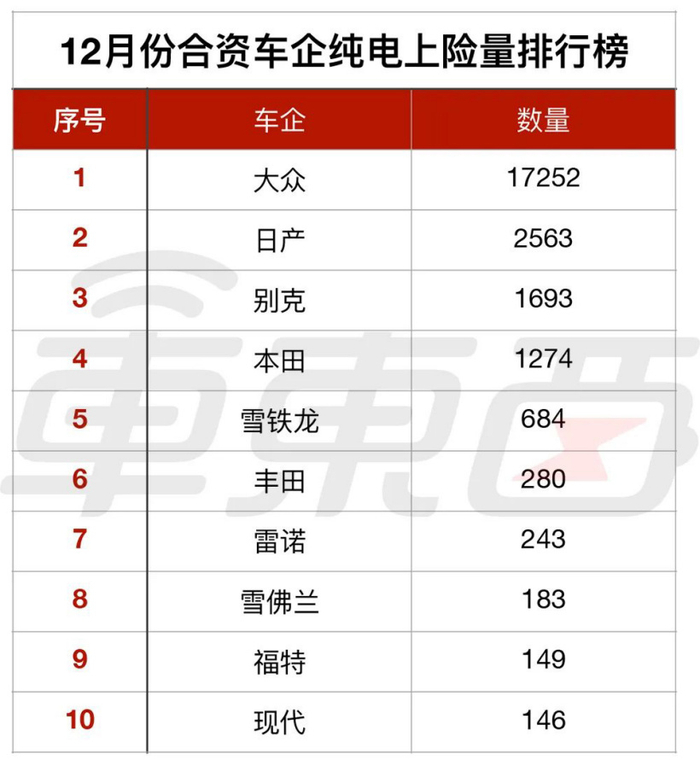 但从上险量来看,大众已经是合资车企唯一的荣光了,其他合资车企的销量都不算出彩,如日产在 12 月份有 2563 辆纯电车上险,本田则是 1274 辆纯电车。