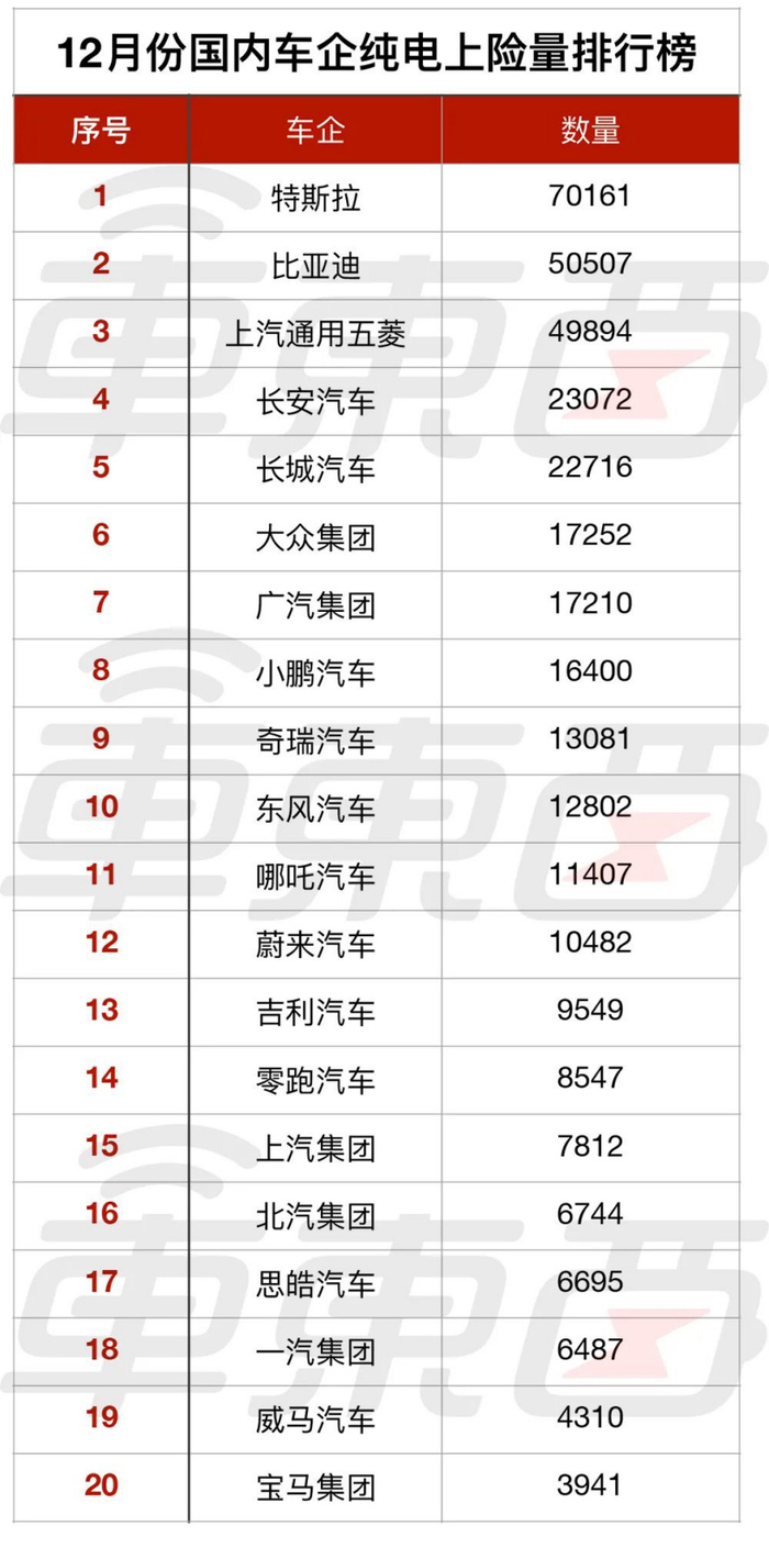 零跑汽车虽然没有实现月销过万,但 12 月份也有 8547 辆车上险,随着重磅车型 C11 的大规模交付,该公司或许也能够维持目前的位置。