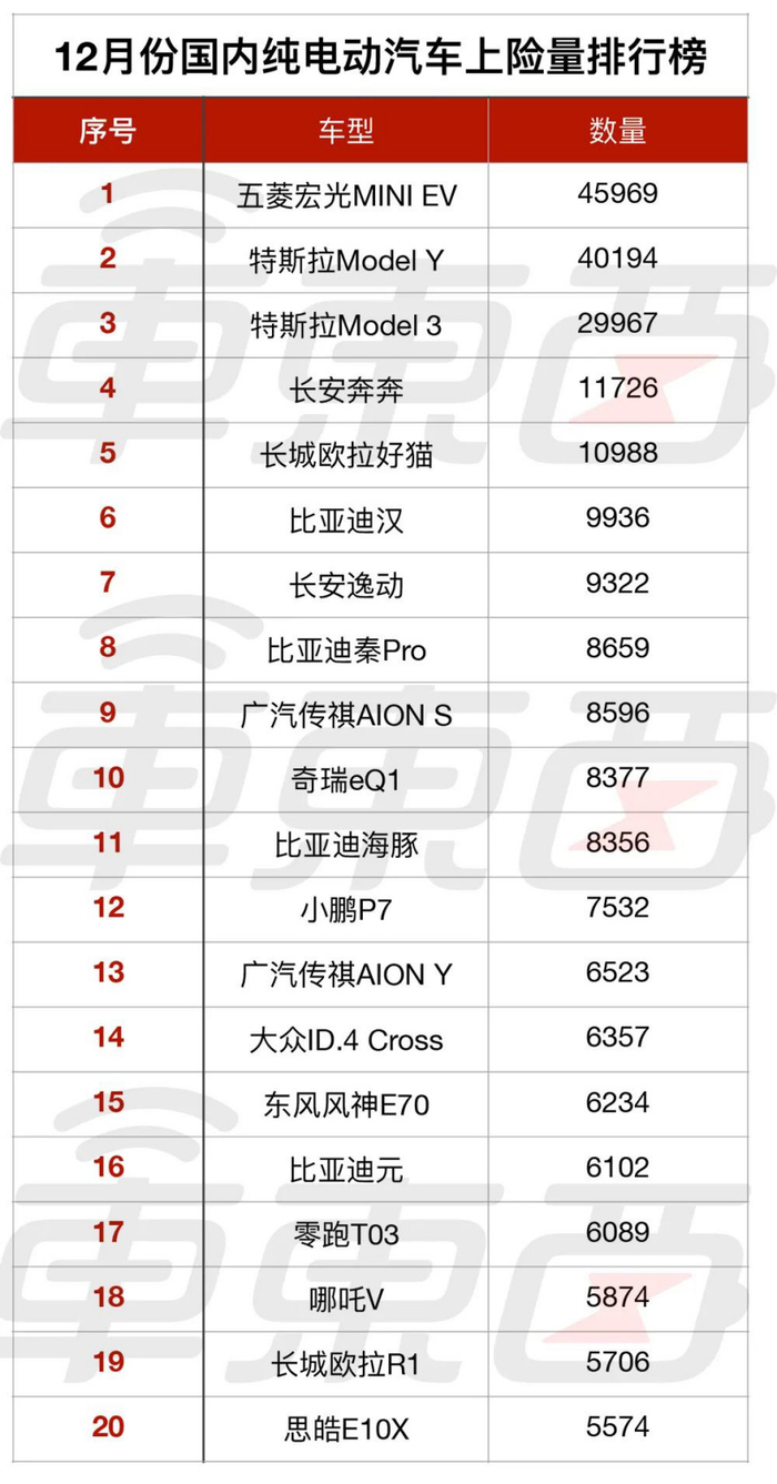 毫无疑问,特斯拉凭借着两款爆款车成为了 2021 年 12 月份最畅销的电动汽车企业,国内新能源汽车一哥比亚迪则仅次于特斯拉。凭借五菱宏光 MINI EV 的畅销,上汽通用五菱排到了第三名。