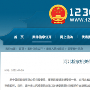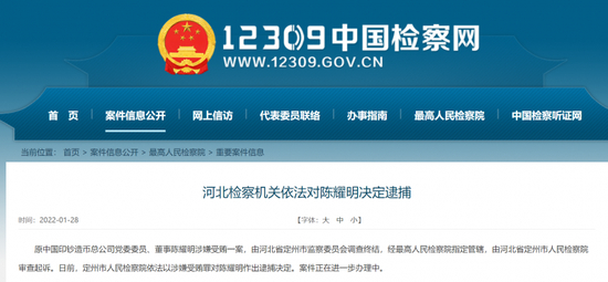 1月28日,12309中国检察网发布消息,原中国印钞造币总公司党委委员、董事陈耀明涉嫌受贿一案,由河北省定州市监察委员会调查终结,经最高人民检察院指定管辖,由河北省定州市人民检察院审查起诉。日前,定州市人民检察院依法以涉嫌受贿罪对陈耀明作出逮捕决定。案件正在进一步办理中。