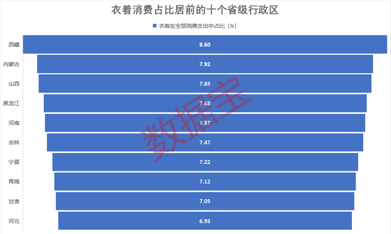 在衣着支出上,北方人显然比南方人要购置更多的衣物御寒。衣着消费占比最高的前十个省份均位于北方,而海南、广西、广东携手成为倒数前三,看来没有冬天的地方自然不需要购买昂贵的羽绒服、大袄,也省去了很多搭配冬装的烦恼。