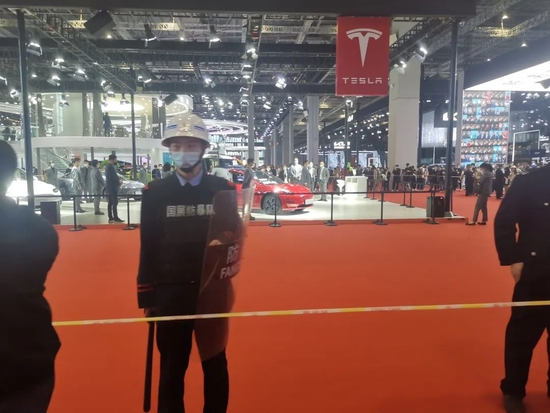 上午11时许,一位身穿“刹车失灵”字样T恤的年轻女士站在一辆特斯拉展车车顶,高声呼喊“刹车失灵”。因行为过激,该女士很快被保安带走,特斯拉展台的正常工作一时中断,数十位保安将其围起约20分钟,用以处置突发事件。关于该事件的视频和图片也迅速在网络上传播。