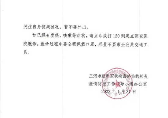 河北省三河市防控办发布最新公告,2022年1月31日,三河市疾控中心接到天津市滨海新区协查函称三河市人员张某为新冠肺炎确诊病例赵某的密切接触者,接触方式为同空间。目前张某已经被集中隔离管控,为寻找张某的密切接触者,现将其行动轨迹公告如下: