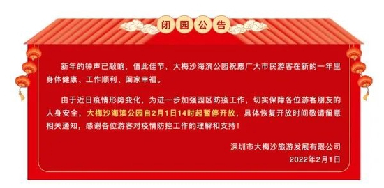 大梅沙旅游微信公众号发布消息称,为进一步加强园区防疫工作,切实保障各位游客朋友的人身安全,大梅沙海滨公园自2月1日14时起暂停开放,具体恢复开放时间敬请留意相关通知,感谢各位游客对疫情防控工作的理解和支持!