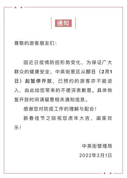 中英街景区发布消息称,因近日疫情防控形势变化,为保证广大群众的健康安全,中英街景区从即日(2月1日)起暂停开放,已预约的游客亦不能进入,由此给您带来的不便深表歉意。具体恢复开放时间请留意相关通知信息。