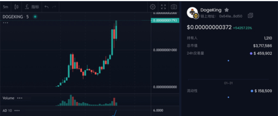 Avedex交易所数据显示,DogeKing币价由0.000000000007美元短线拉升至0.00000000372美元,24小时交易量达46万美元。