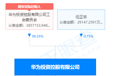 天眼查数据显示,华为投资控股有限公司只有两个股东:华为工会委员会和唯一一个自然人股东-任正非,其中,华为工会持股99.25%,任正非持股0.75%。