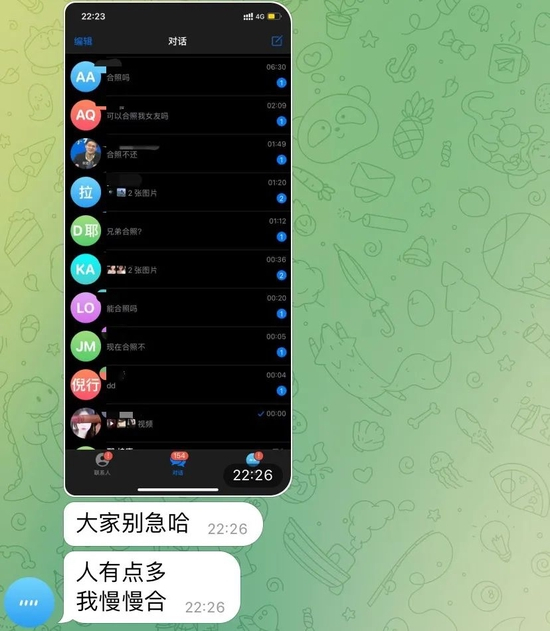 一个叫“Lukas”的成员就在群里抱怨过,上次一个收图的人因为只有一台设备,没办法给他发回“合照”,他忿忿地说:“每个人至少要有两部手机,这应该写入章程里”。而那些只收图不返还的人会被截屏到群里,指责他们是“没有素质的盗图狗”,让其他成员小心受骗。