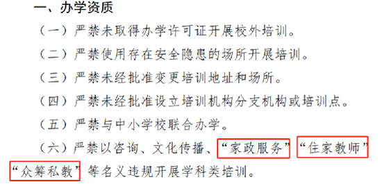其中办学资质方面,严禁与中小学校联合办学;严禁以咨询、文化传播、“家政服务”“住家教师”“众筹私教”等名义违规开展学科类培训。