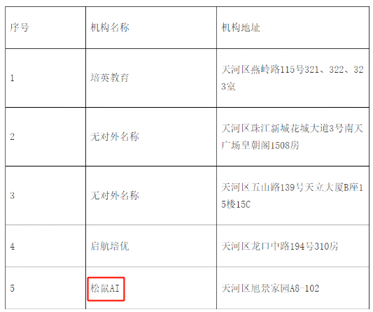 天河区公布2022年第一批校外培训机构白名单若干,及黑名单5家。另一家知名机构松鼠AI赫然出现在黑名单上,具体违法行为未列示,仅显示地址为“天河区旭景家园-A 802”,从该地址来看,教学点在一个居民小区里。