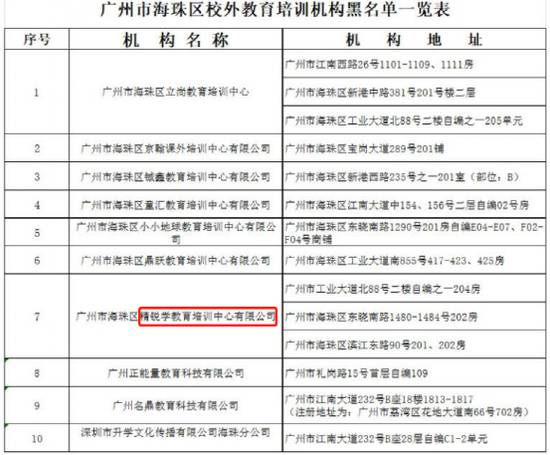 海珠区公布校外培训机构白名单186家,黑名单10家,精锐教育三家教学点同样上了黑榜。