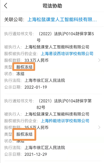 天眼查信息显示,上海松鼠课堂人工智能科技有限公司(即松鼠AI)作为被执行人,近几个月其持有的上海易设西培训学校有限公司、上海矜能培训学校有限公司、上海昂立教育投资咨询有限公司等8笔股权被法院冻结。