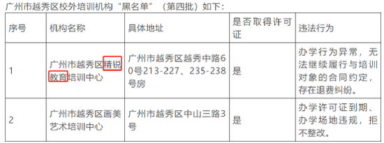 越秀区公布了2家存在办学行为异常或场地违规等违法行为的黑名单机构,分别是广州市越秀区精锐教育培训中心、广州市越秀区画美艺术培训中心。其中精锐教育的违法行为显示为“办学行为异常,无法继续履行与培训对象的合同约定,存在退费纠纷”。