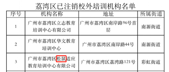 中国基金报记者注意到,精锐教育和松鼠AI两家知名机构上了黑名单,其中精锐教育涉及广州越秀区一个教学点、海珠区三个教学点,而松鼠AI则上了天河区教育局的黑名单,以及荔湾区的注销机构名单。