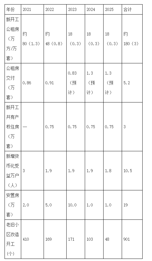 具体指标:新建公租房约3万套、约180万方;新增保障性租赁住房30万套(间);新开工安置住房计划总计19万套、2800万平方米以上。改造老旧小区数约900个,户数约35万套。探索共有产权住房建设,新开工共有产权住房3万套、270万方。新增公租房货币化补贴受益人口10.5万户(人)。