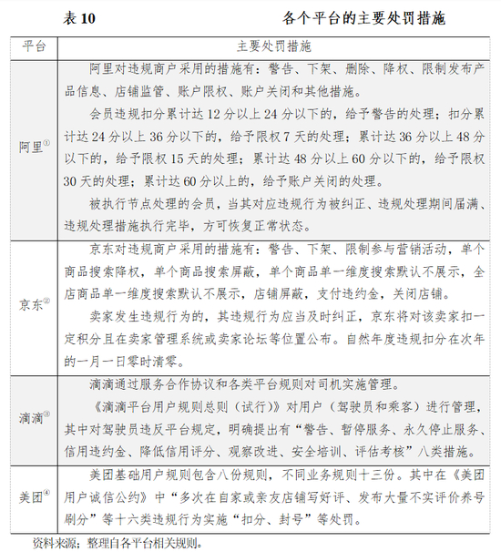 平台的规则设置灵活多样,评罚结合,从扣分扣点到罚款,到评价体系和声誉机制;从搜索降权到搜索屏蔽,再至降低活跃度以至驱逐出平台,很灵活很实用。表10中是若干平台的主要处罚手段。