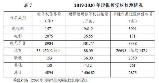 视频内容侵权也是平台突出问题。2019年至2020年10月,12426版权监测中心监测的电影、电视剧、综艺节目、体育赛事、动漫等类型4894件作品中,共监测到短视频疑似侵权链接1406.82万条,平均每项体育赛事的短视频侵权量达2.67万条;电视剧作品单部作品短视频侵权达到5991条(见表7)。这些侵权问题通过主流平台维权成功率超过95%。