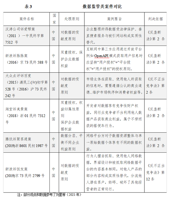 与个人信息保护已有法律规范不同,企业数据权属和应用监管秩序仍在探索,并且处于持续调整完善过程中。对于企业运营中产生的业务数据(非个人数据),法院通过典型案例判决,例如在“汉涛公司诉爱帮案”“大众点评诉百度”“新浪微博诉饭友”“阿里巴巴诉码注”“淘宝诉美景”等多起案件,通过法律判决探索和规范数据市场的运行秩序,明确了对企业数据权益的保护。从2011年到2019年国内典型的关于企业数据和个人数据获取的判例来看,对于数据要素的监管可以概括为以下几点(见表3)。