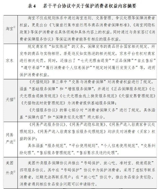 消费者是平台生存发展的基础,与线下消费者主要是购买者的身份相比,平台消费者具有购买者和信息提供者双重身份,地位更加重要。同时,平台上交易双方不见面,产品品质既不能事先查验,也不能在交易中“眼见为实”,商户稳定性差,如果没有平台严格监管,交易中各种欺诈行为将呈现较高概率。因此在多个平台的协议中,关于保护消费者权益的内容处于首要地位。下面是一些著名平台的协议中关于保护消费者权益的内容(表4)。