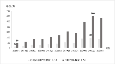 每个平台都是新内容迅速上线,新产品市场占比在迭代中处于高位。以视频网站哔哩哔哩(以下简称B站)为例,B站月均活跃主播(UP主)和月均投稿数量,2018年初为30万和90万,到2020年2季度,就分别增长到了190万和600万(图8)。如此数量的主播和上线内容,是任何线下娱乐形态所不可比拟的。