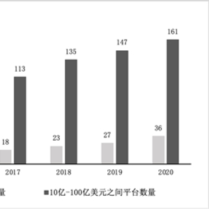过去6年,我国数字平台经济呈现大规模发展,截至2020年底,我国价值超过10亿美元的数字平台企业有197家,比2015年增加133家;2015-2020年间,我国超过10亿美元的数字平台企业价值由于7702亿美元增长到35043亿美元,年复合增长率达35.4%,并呈现中型平台规模不断扩张且成长为大型平台加速的趋势(图1)。