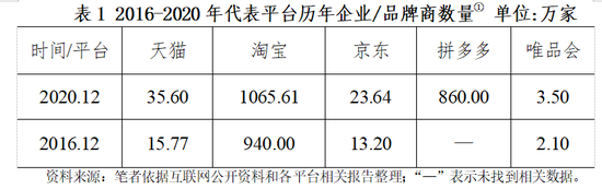 大型平台不仅是一个规模巨大的企业,还是巨量交易场所和联接广泛的基础设施提供者。平台上有数以十万计、百万计的商家和以千万计甚至亿计的消费者,提供的商品和服务内容丰富,数量庞大,交易和交互数量巨大,是一个局部市场。同时,平台联接范围极广,接入平台成为企业参与分工与协同网络的基础条件,因此平台也具有基础设施的性质。以下是几个代表性购物平台上的企业/品牌商数量(表1)。