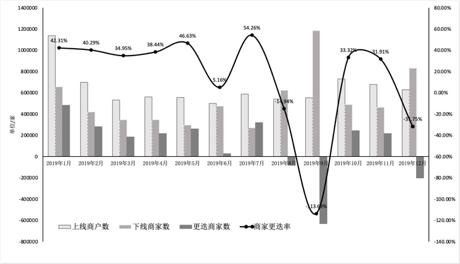 首先,网络店户不仅数量巨大而且更迭频繁。相对于传统线下企业进入和退出市场的不易,平台上的企业进退很便捷,商家你进我出,更迭迅速。从国内某平台2019年各月上、下线商家的情况看,多数月份新上线和新下线的企业相加超过100万户,个别月份超过1000万户(主要是下线企业)。这是由于每年度会对线上僵尸企业实施定期的清退(图2)。