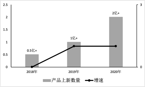 然后,产品上新迅速。由于平台上新几乎没有门槛,成本较低因而也无需对销售规模有较高预期,平台新品销售数量呈现爆发式增长,新品成为促进消费的主力军。2020年,天猫新品总量已经达到2亿多(图4);京东年度上新数量超过千万,新品销售贡献率2019年为58%,2020年度上升为62%。