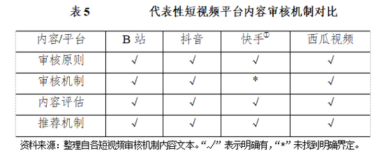 内容审核是文字信息和视频发布平台保障内容合规的重要自治手段,平台希望通过审核机制,能够规范平台上主体行为、创造良好平台环境和社会形象。通过对国内代表性短视频平台审核机制的分析,平台内容审核总体可以概括为审核原则、审核机制、内容评估、推荐机制等(见表5)。以抖音为例,其通过“机器检测、人工检测、用户反馈、叠加推荐”等的多重机制,努力实现对视频内容的把关,优荐劣汰。