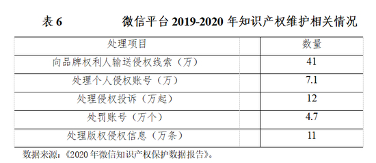 微信作为目前最大的社交平台,每天发布原创文章3万—4万篇,平台通过标注“原创”印记,实施品牌保护。截止2019年上半年,微信平台三年累计超过1亿的文章被标明“原创”。 对于侵权者,采取处理个人侵权账号、禁止使用朋友圈、向品牌权利人提供仿冒品信息线索等(见表6)。