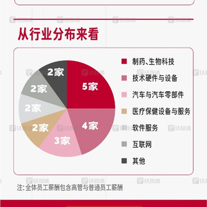 4、医药行业高管薪酬普遍较高。排名前20的科技型企业中,有7家来自医药行业;个人年薪排名前50的高管,有29人来自医药行业。