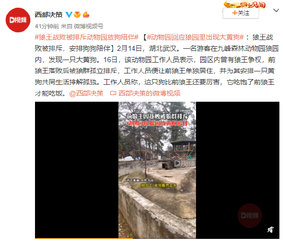 #狼王战败被排斥动物园放狗陪伴# 【#动物园回应狼园里出现大黄狗# :狼王战败被排斥,安排狗狗陪伴】2月14日,湖北武汉。一名游客在九峰森林动物园狼园内,发现一只大黄狗。16日,该动物园工作人员表示,园区内曾有狼王争权,前狼王落败后被狼群孤立排斥,工作人员便让前狼王单独居住,并为其安排一只黄狗共同生活排解孤独。工作人员称,这只狗比前狼王还要厉害,它吃饱了前狼王才能吃饭。